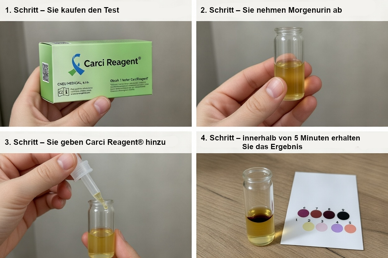 Carci Reagent® ist ein zertifiziertes, in vitro diagnostisches Medizinprodukt (IVD) zur orientierenden Erkennung bestimmter Tyrosin–Metaboliten im Urin – ein potenzieller Hinweis auf metabolische Veränderungen im Körper, die bei malignen Prozessen auftreten können. Der Test wurde für die einfache, nicht–invasive Anwendung zu Hause entwickelt und liefert ein Abschlussergebnis in nur 3–5 Minuten.