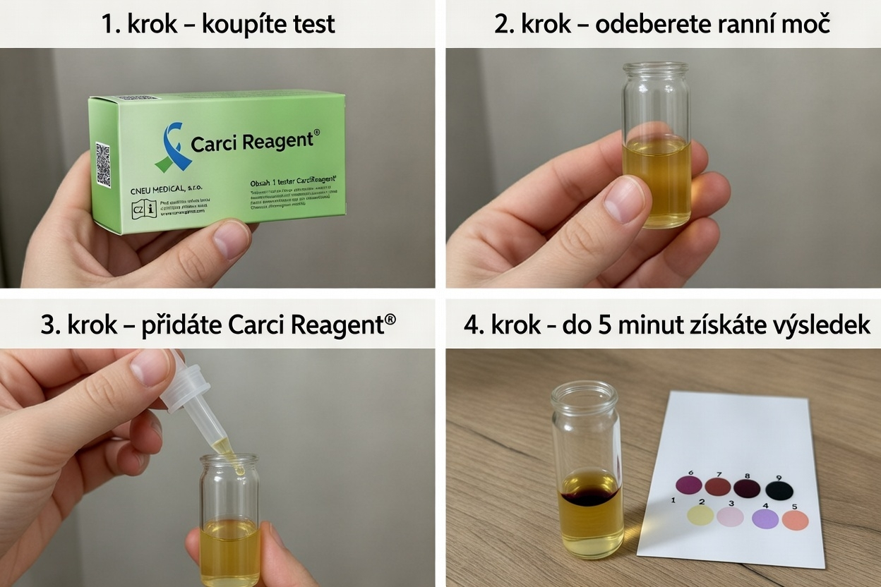 K provedení testu potřebujete jen čistou nádobu na moč (není součástí balení). Přesný postup jak test provést najdete v článku Jak provést domácí test Carci Reagent® a správně vyhodnotit výsledek
