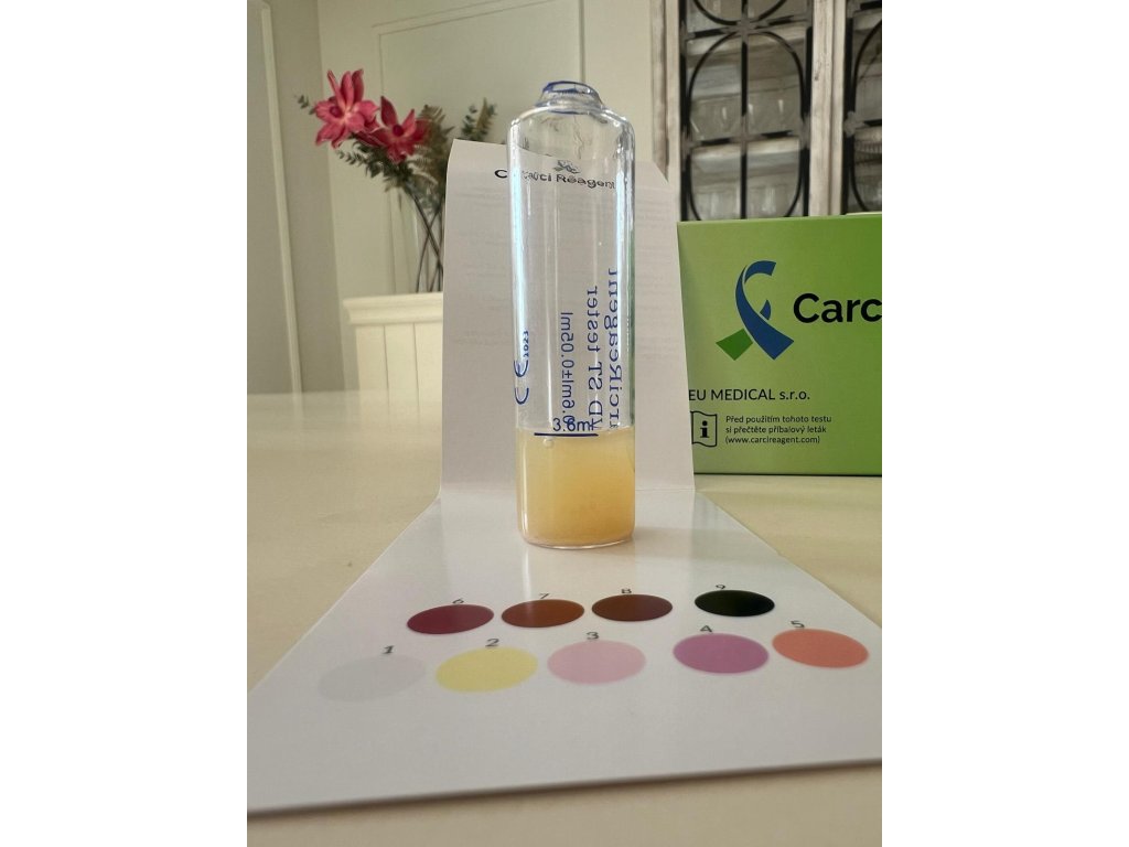 Carci Reagent ® test využívá jednoduchou chemickou reakci, díky které během několika minut zjistíte, zda je ve vaší moči přítomno zvýšené množství metabolitů tyrosinu.